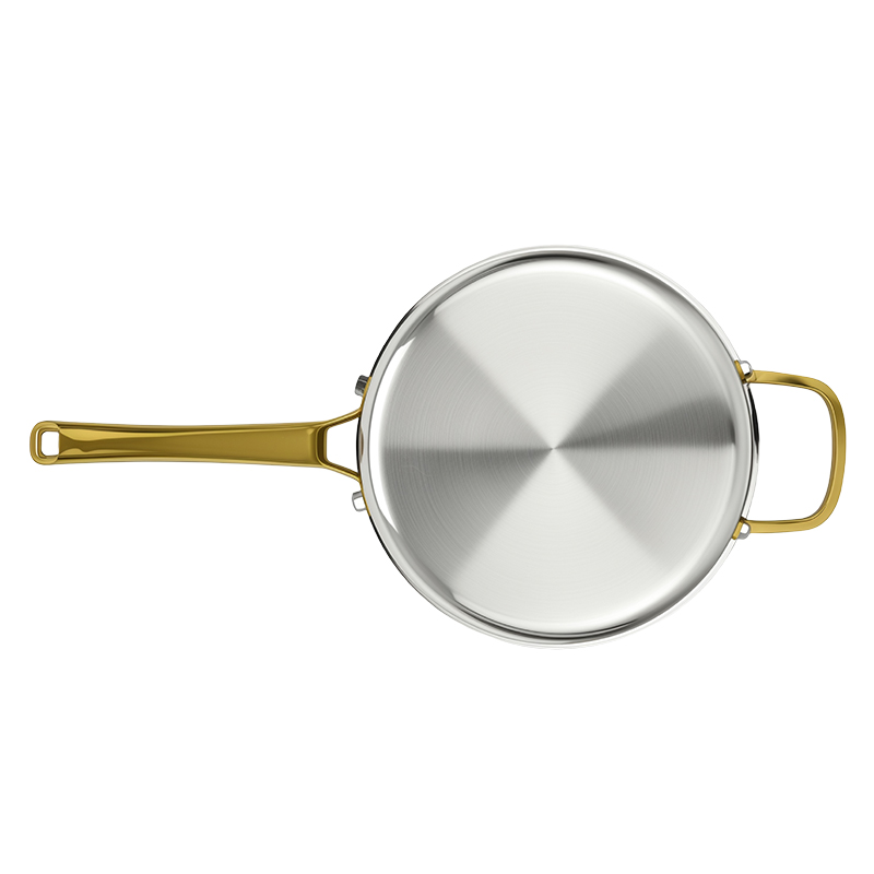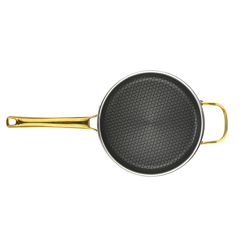 يتميز الجزء الداخلي للمقلاة بطبقة محفورة على شكل قرص العسل، مما يتيح توزيعًا موحدًا للحرارة وهو آمن تمامًا لصحة الإنسان. يجمع الجزء الخارجي من هذا التصميم بين اللمسة النهائية المصقولة والملمس المطروق المميز —مما يعكس راحة الجزء الداخلي، ويضمن هذا التصميم سهولة التنظيف ويقلل من وقت التنظيف بعد الطهي للمستخدمين.