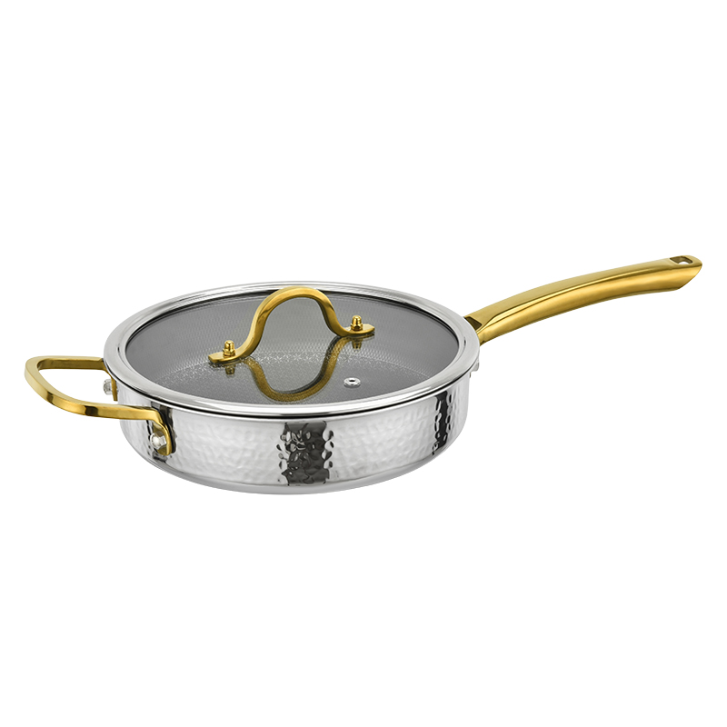 يعزز الملمس المطروق مقاومة الخدش والجاذبية البصرية للمقلاة. بالإضافة إلى ضمان المتانة طويلة الأمد لسنوات من الاستخدام الموثوق، فإنه يضفي أيضًا على مطبخك طبقة إضافية من السحر المتطور.